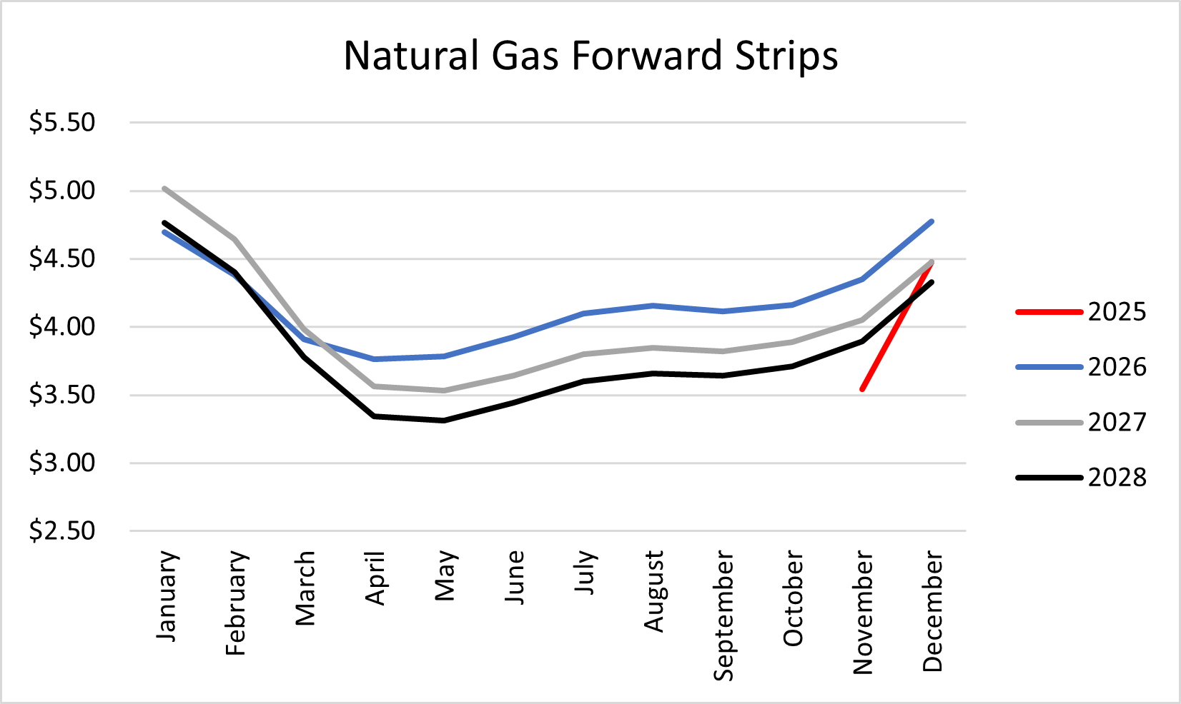 EIA’s latest Short-Term Energy Outlook is forecasting natural gas to average $3.90/MMBtu in November through March and $4.00/MMBtu in 2026 – this is a significant reversal from the prior Short-Term Energy Outlook.