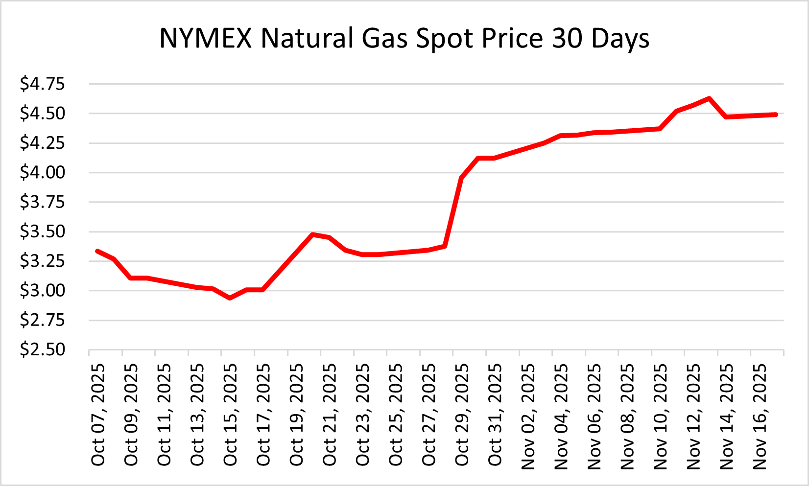 Spot NYMEX Natural Gas is showing support at $4.15 and resistance at $4.70. Spot natural gas gapped up November 24 upon the November 2025 contract expiring. Upon expiration, prompt switched to December 2025, a far more volatile month, which is consistent with historical performance.