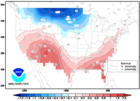 The 8-14 Day Temperature Outlook shows the lower 48 split in half with the west expecting colder than normal temperatures and the east above normal temperatures. The 6-10 Day Temperature Outlook is mostly red across the board. It will be interesting to see if the 8-14 Day Temperature Outlook actually materializes and brings cold weather to the west. The seasonal forecast, which is becoming more precise with growing confidence at this time of the season, is indicating a warmer than normal winter for the southern US and the potential for unseasonably cold weather in the northwest.