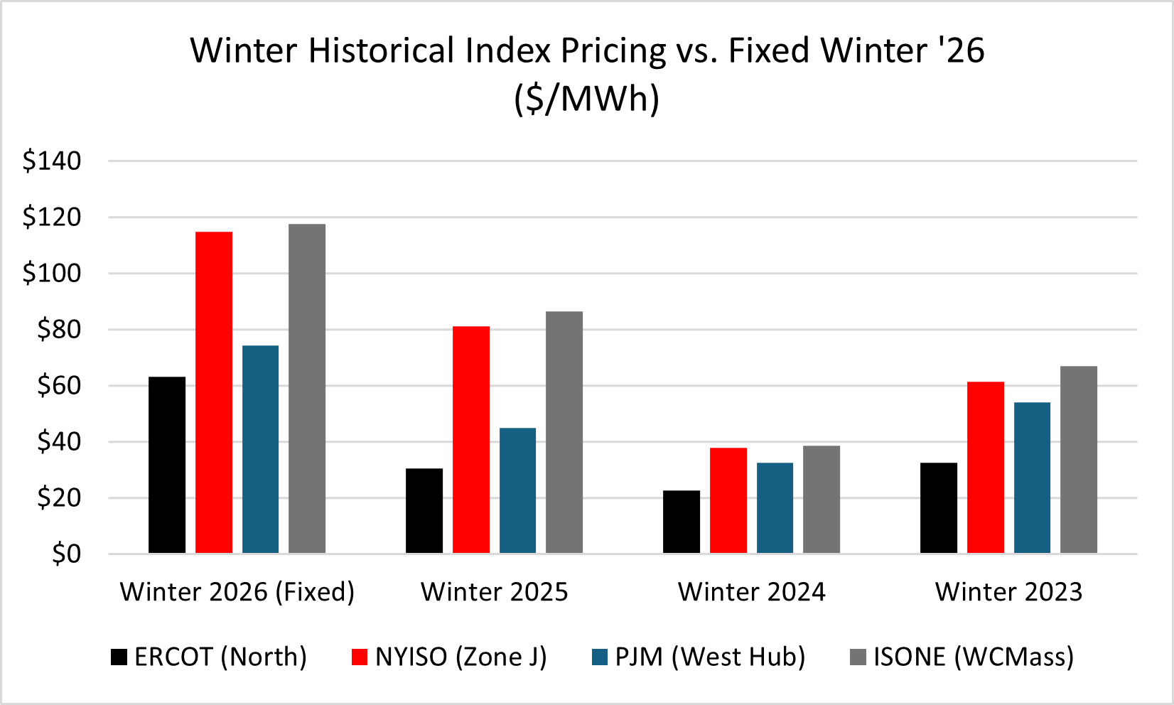 Summer 2025 real-time pricing for NYISO increased 56% vs. summer 2024, PJM Western Hub increased 35%, ISO-NE increased 27%, and ERCOT increased 16%. These increases across the board have contributed to increased fixed prices for summer 2026 where premiums versus the settled summer index prices range from 25% (NYISO) to 173% (ERCOT). These premiums point to volatile historical index pricing as well as demand growth in these particular ISO’s.