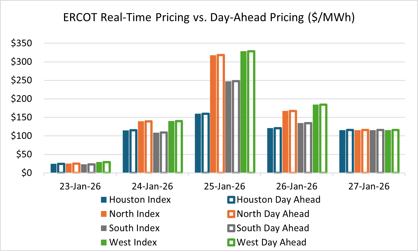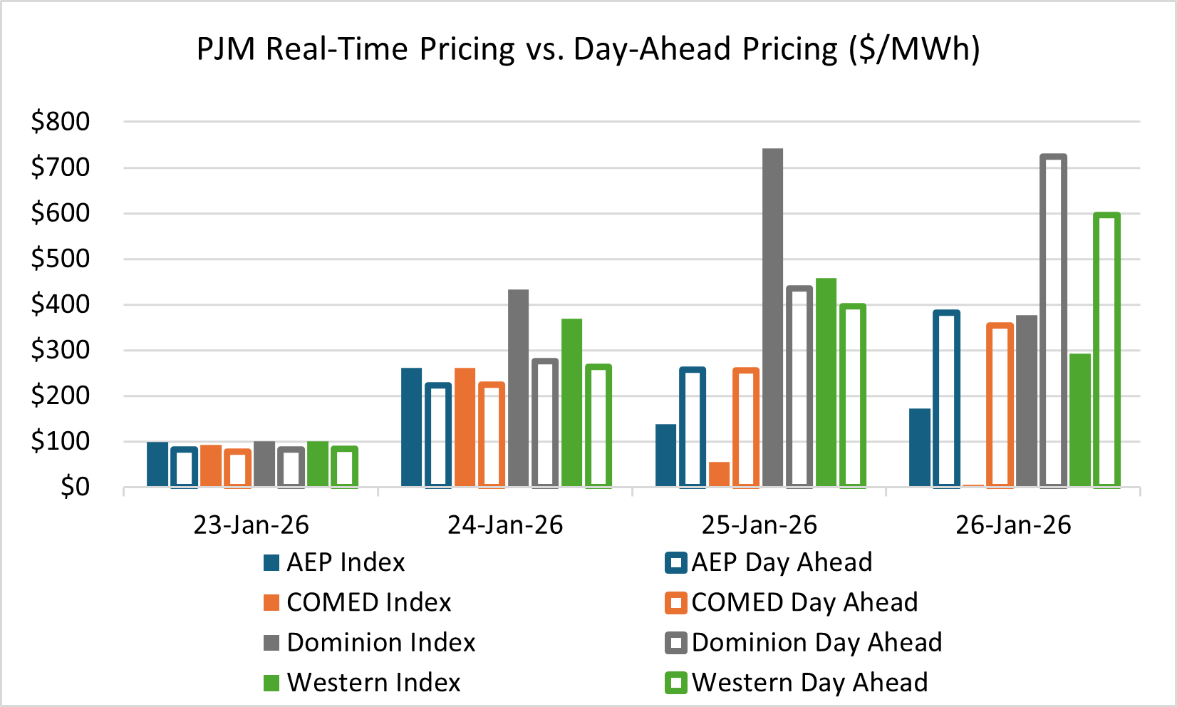 ERCOT performed well during Winter Storm Fern. Real-time pricing was not as volatile as other parts of the country. Interestingly, when compared to PJM, we can see pricing in the day-ahead market was far tighter bound to real-time pricing. This is indicative of better load forecasting, less unplanned outages, and favorable actual weather vs. forecasts.