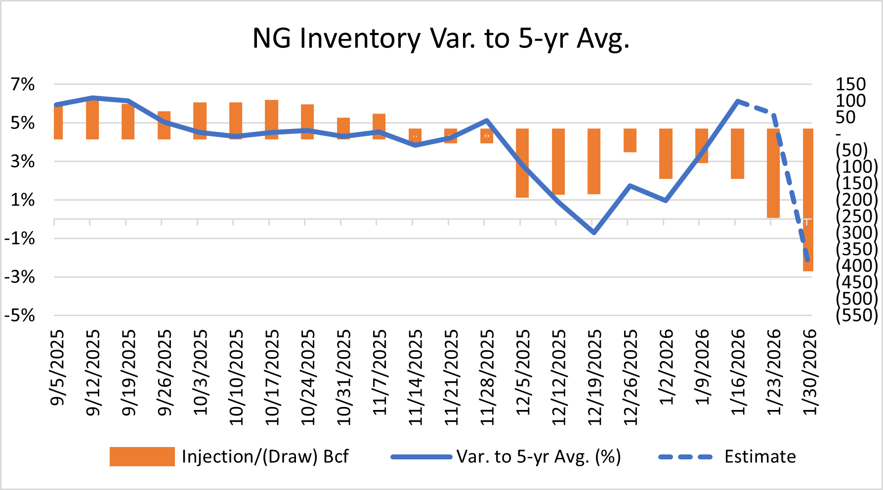 January 29th’s EIA Natural Gas Inventory Report will cover week ending January 23. This report will not cover the full impact of the winter storm. The following week, the February 5 Inventory Report will cover the entirety of Winter Storm Fern. The 1/23 draw is expected to be around 250 Bcf. The 1/30 draw is expected to be around 400 Bcf. This could be a record setting late-January draw. Inventories currently sit comfortably 5% above the 5-yr average and 6% above the year-ago mark. We expect these surpluses to erode to a deficit to the 5-yr average.
