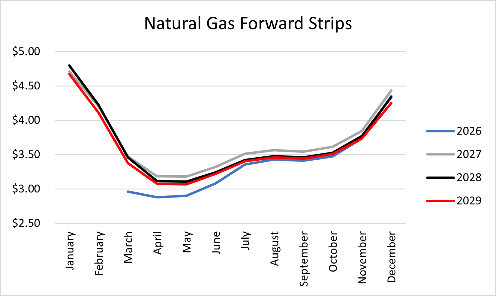 Balance year 2026 finds support at $2.88 with resistance at $4.35. Calendar year 2027 has support at $3.18 with resistance at $4.71. Calendar year 2028 has support at $3.10 with resistance at $4.48 – these future strips are essentially in line with our last publication. These numbers are based on wholesale future contract price action, which somewhat contradicts the EIA’s forecast suggesting Henry Hub will average $4.30/MMBtu in ‘26.
