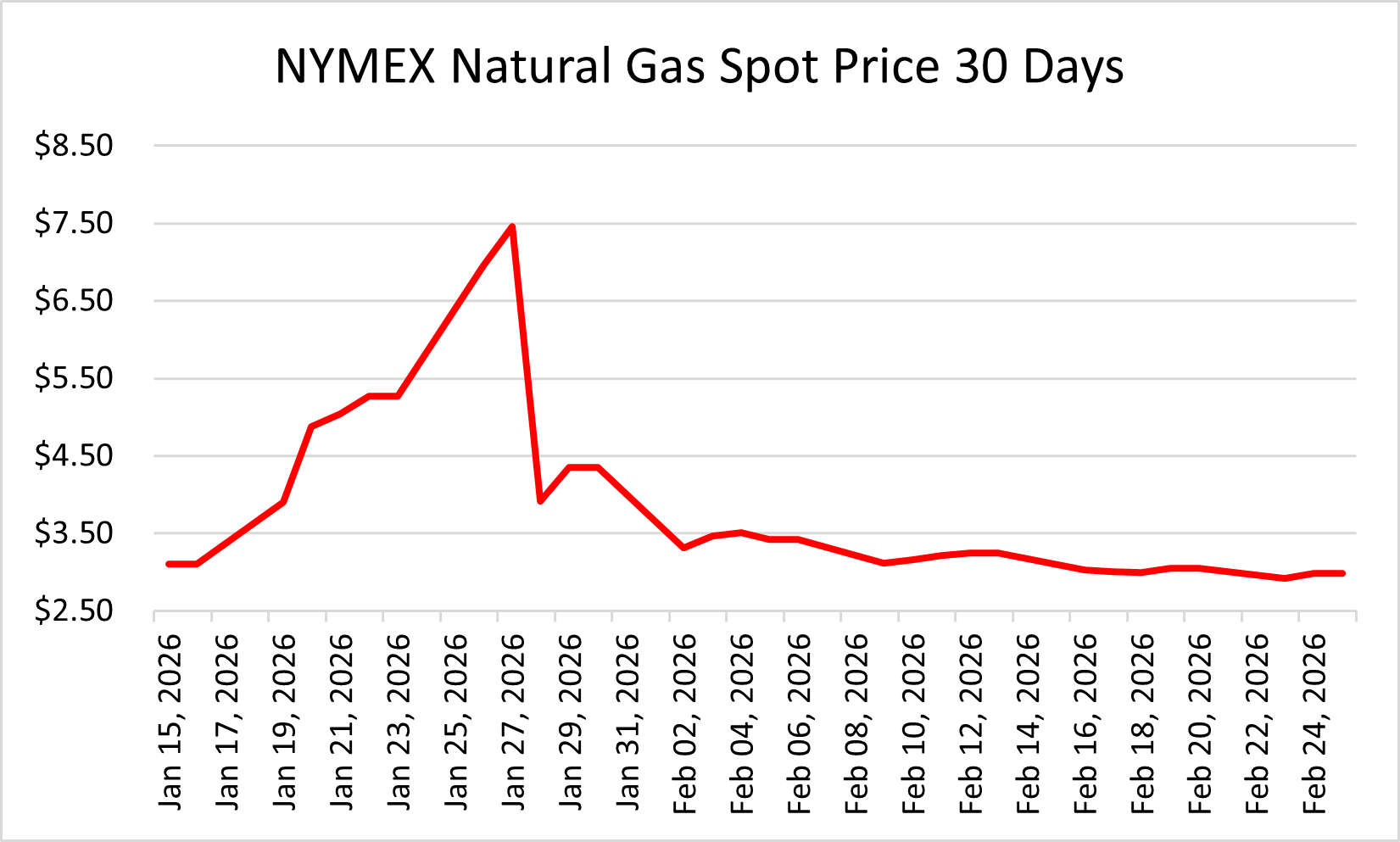 Spot NYMEX Natural Gas fell drastically with the passing of Winter Storm Fern. Fern did not develop into as severe of a storm as some speculators anticipated. Considering the time of year, with the bulk of winter risk behind us, natural gas prices quickly retreated and have held steady at <$3.50.