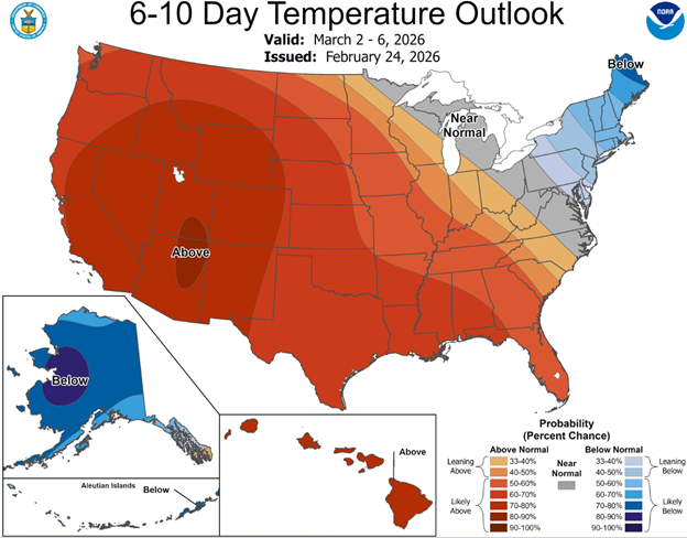 The 6-10 Day and 8-14 Day Temperature Outlook show above normal temperatures for the vast majority of the lower-48, with some slightly cooler than normal temperatures in the Northeast in the short-term.
